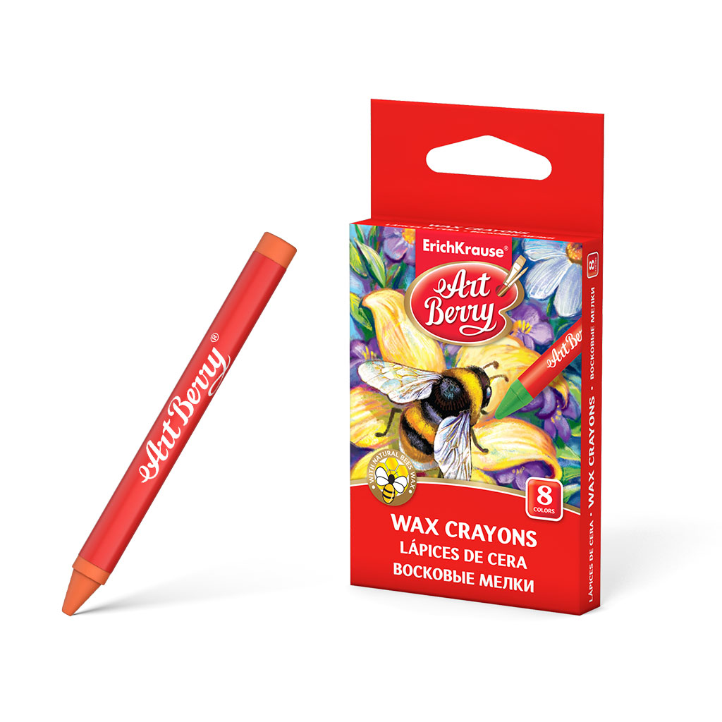 Creioane cerate ArtBerry® contin ceara naturala de albine, conferind un miros placut, fata de brandurile competitoare. Creioanele din ceară conferă linii strălucitoare, culori vii, ajutând astfel la o colorare ușoară a cartonului, hârtiei și nu necesită ascuțire Culorile : galben, portocaliu, roșu, roz, mov, albastru, verde, maro Fiecare creion este ambalat special în hârtie, pentru a preveni murdăria Formă rotundă cu diametrul de 7 mm, preascuțită, rezistentă la rupere. Desenele nu își pierd luminozitatea în timp, datorită componentelor responsabile pentru protecția UV. Certificatul European de calitate (CE) garantează absența substanțelor toxice.